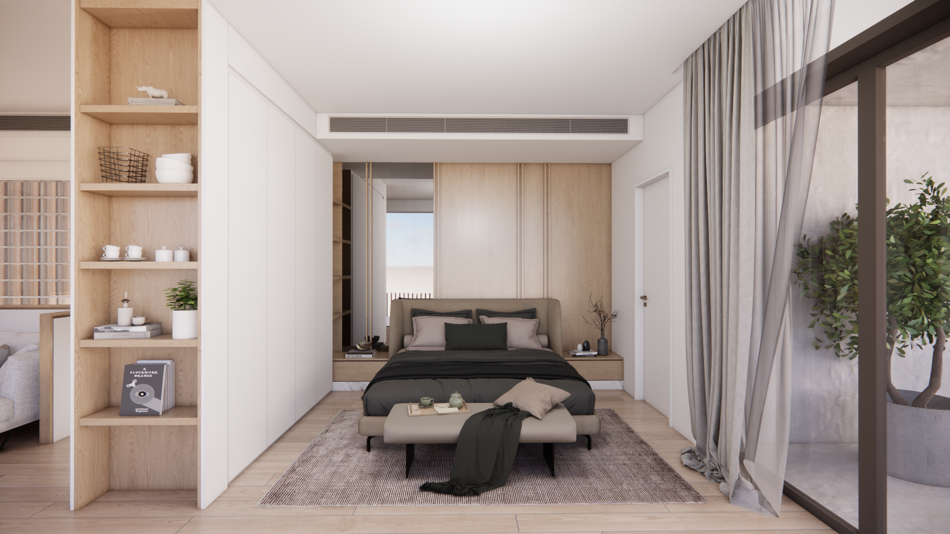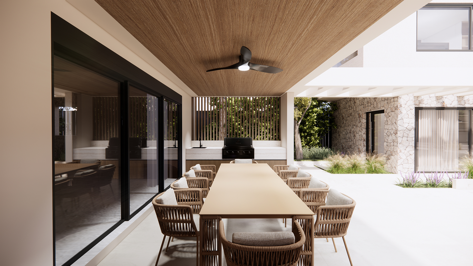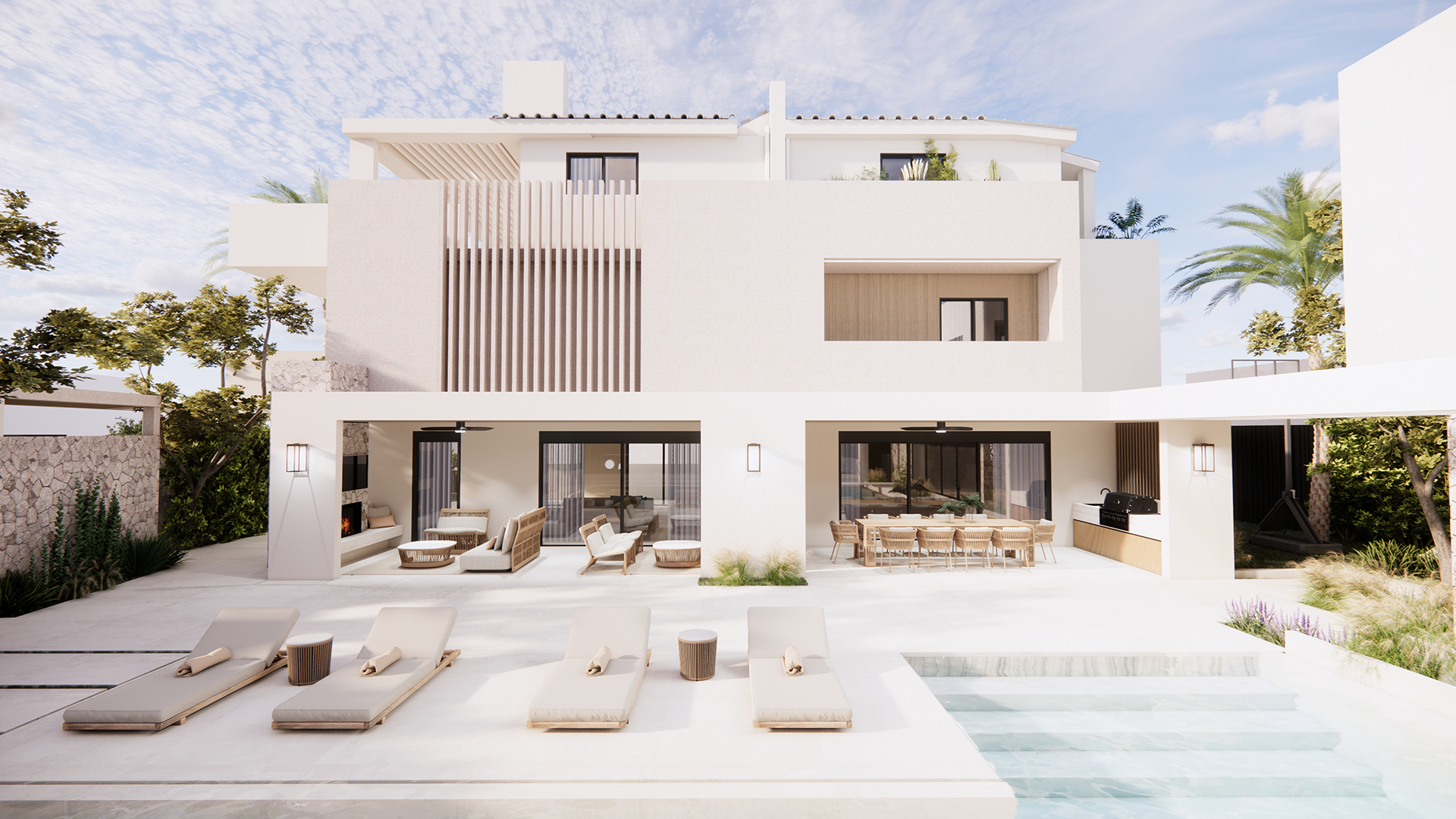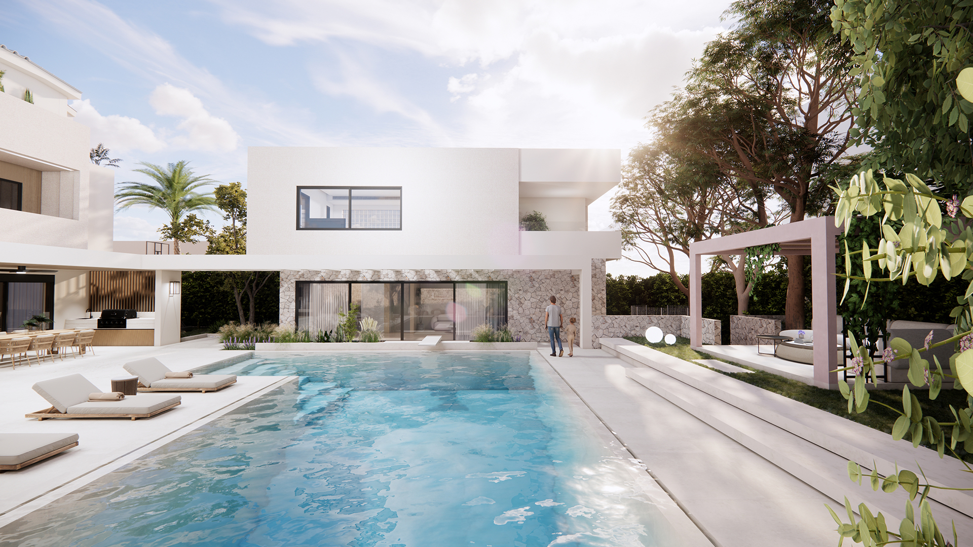 The outdoor space plays a central role in the overall concept and is treated as an extension of the interior living areas. The swimming pool is positioned at the heart of the courtyard, organizing the surrounding outdoor functions such as lounge areas, sunbathing zones and the Pavilion. Designed as an independent yet fully integrated structure, the pavilion provides shaded living and support spaces for outdoor activities, while enhancing privacy and spatial hierarchy.